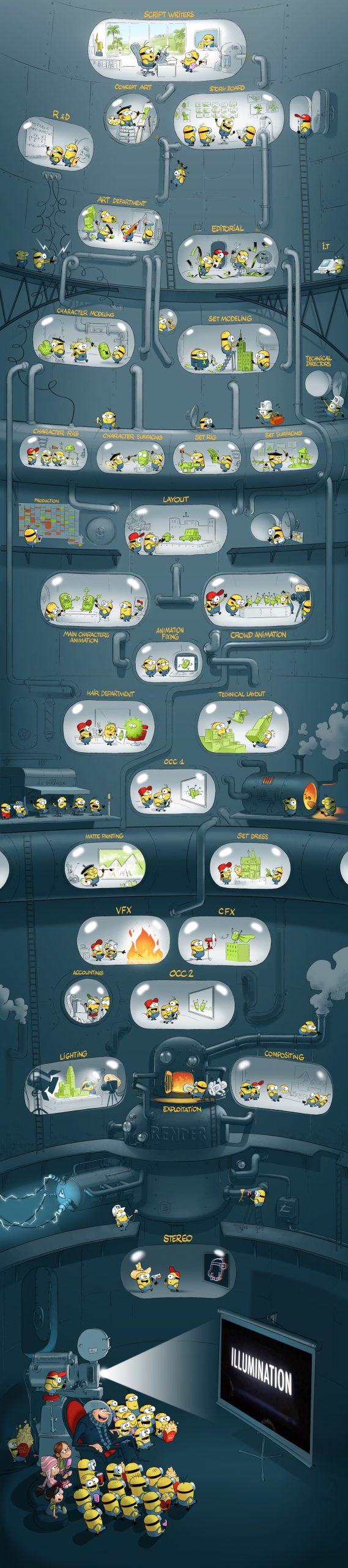 Si vous ne connaissez pas TOUS les métiers de la 3D et des effets visuels, cela tombe bien ! Le studio français Illumination Mac Guff, connu notamment pour les films « Moi, moche & méchant », « Tous en scène » ou encore « Comme des bêtes » a sorti une illustration gé-niale sur leur processus de production. Ils présentent les différents départements de la production… avec des minions 👇